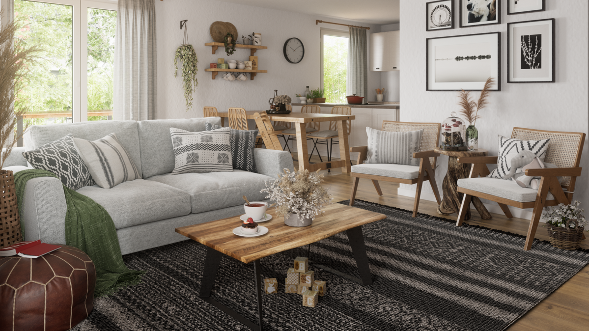 Viele Familien verbringen den Großteil ihrer Zeit im gemeinsamen Wohnbereich. Hier wird gespielt, gegessen, gelernt und geredet. Ein Bungalow lässt sich so gestalten, dass Küche, Esszimmer und Wohnzimmer nahtlos ineinander übergehen und damit ein zentraler Treffpunkt für die ganze Familie entsteht.