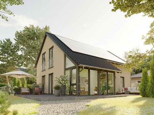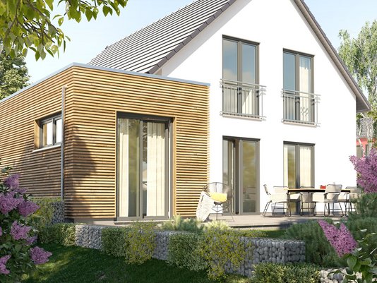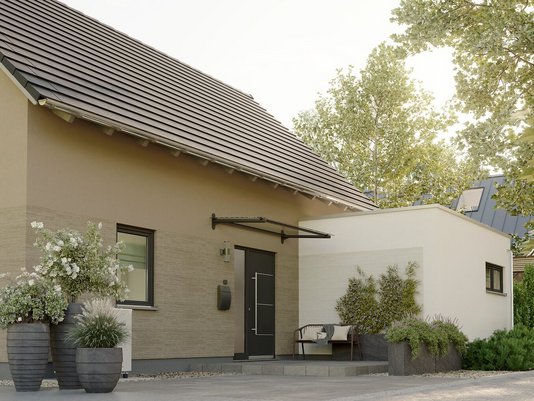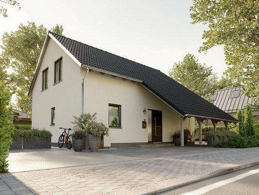 Auch in der Ausführung lässt sich das Haus flexibel an persönliche Wünsche anpassen. So kann zum Beispiel ein Wintergarten-Anbau den Wohnraum um ca. 8 m² erweitern – ideal als sonniger Essbereich oder gemütliche Leseecke. Dank des großzügigen Dachüberstands ist es zudem möglich, einen Carport und einen überdachten Eingangsbereich harmonisch anzubauen. Diese optionalen Extras zeigen die Vielfältigkeit des Bodensee 129, das je nach Bedarf mit Wintergarten, Carport oder weiterer Ausstattung konfiguriert werden kann. Standardmäßig erfüllt das Haus bereits hohe Energiestandards (KfW-Effizienzhaus 55) und kann auf Wunsch sogar als Effizienzhaus 40 gebaut werden – was zusätzliche Fördermöglichkeiten eröffnet. Kurz: Das Bodensee 129 vereint Komfort, Energieeffizienz und Anpassungsfähigkeit in einem attraktiven Gesamtpaket.