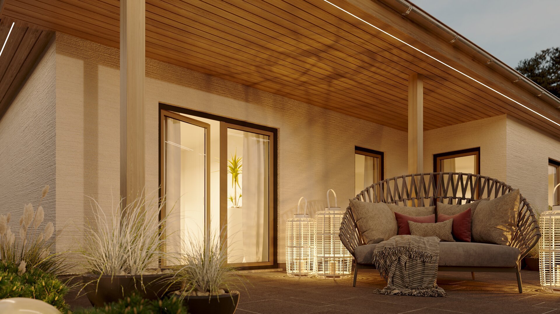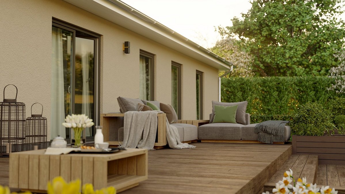 Ein besonderes Augenmerk sollten Sie auf die Fenster legen. Bodentiefe Fenster sind nicht nur ein optisches Highlight, sie lassen auch jede Menge Tageslicht ins Haus. So verschmelzen Innen- und Außenbereich fast nahtlos miteinander. Apropos Außenbereich: Eine großzügige Terrasse gehört für viele zu einem solchen Luxus-Objekt einfach dazu und sollte beim Bungalow bauen nach Möglichkeit gleich mit eingeplant werden.
